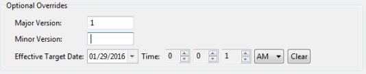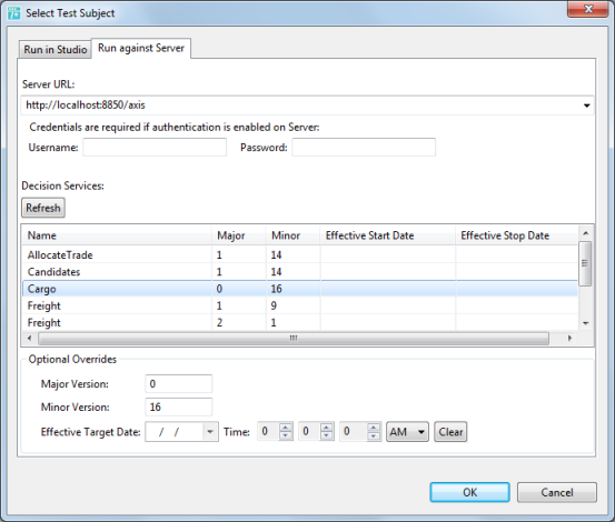 9. When the selected Decision Service was deployed with a date range defined, it is active from the effective date through the expiration date. You can apply overrides to change the test Decision Service's version or to simulate the Ruletest's call as occurring at a specific point in time. Specify your preferred values -- major version + effective target date -- as illustrated: