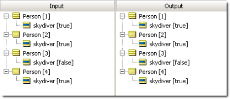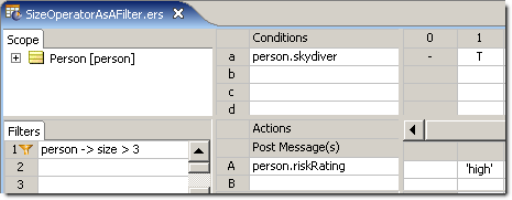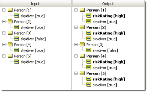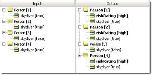 What happened here? Because Filters are always applied first, our Rulesheet initially screened or filtered out the elements of collection person whose skydiver value was false. Think of the Filter as allowing only skydivers to pass through to the rest of the Rulesheet. The Conditional rule then checks to see if the number of elements in collection person is more than 3. If it is, then ALL person elements in the collection that pass through the filter (in other words, all skydivers) receive a riskRating value of 'high'. Because our first Ruletest included only 3 skydivers, the collection fails the Conditional rule, and no value is assigned to riskRating for any of the elements, skydiver or not.