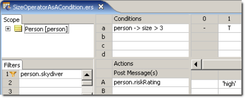 Unfortunately, order independence does not apply to conditional expressions that include collection operations. In the following Rulesheets, notice that one of the conditional expressions uses the collection operator ->size, and therefore must use an alias to represent the collection Person.